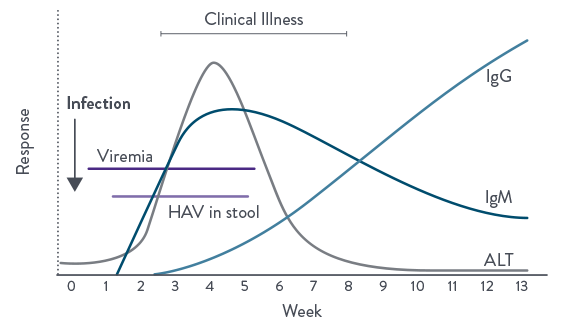Da symptomatische Infektionen mit dem Hepatitis-A-Virus (HAV) klinisch nicht von einer Infektion mit dem Hepatitis-B- oder Hepatitis-C-Virus zu unterscheiden sind, ist ein serologischer Test ein wichtiges Hilfsmittel für eine korrekte Diagnose. Während der akuten Phase der HAV-Infektion ist Anti-HAV-IgM im Serum des Patienten vorhanden und ist fast immer bei Auftreten der Symptome nachweisbar.7–10